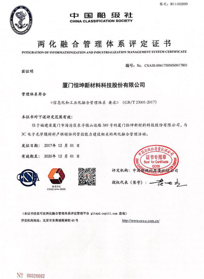 近日,廈門恒坤新材料科技股份有限公司(以下簡(jiǎn)稱廈門恒坤)順利通過國(guó)家兩化融合管理體系認(rèn)證評(píng)定,并取得相應(yīng)證書(編號(hào):CSAIII-00617IIIMS0017801)。此次評(píng)定標(biāo)志著廈門恒坤的信息化管理已經(jīng)達(dá)到綜合集成和協(xié)同創(chuàng)新的水平。